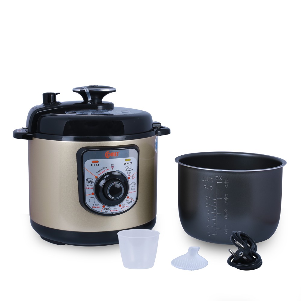 - Nồi áp suất Comet dung tích 6L hỗ trợ bạn nấu và hầm các món ăn trong thời gian ngắn, giúp tiết kiệm thời gian và công sức khi nấu nướng. Nồi với 10 chức năng như hầm đậu, thịt bò, gân, xương và nấu các món cơm, canh, súp, cháo…, thức ăn được nấu bằng nồi áp suất sẽ có vị thơm ngon mà không bị mất chất dinh dưỡng. Nồi áp suất Comet còn có thiết bị điều chỉnh nhiệt và nắp khóa an toàn, đảm bảo an toàn tuyệt đối cho người sử dụng.