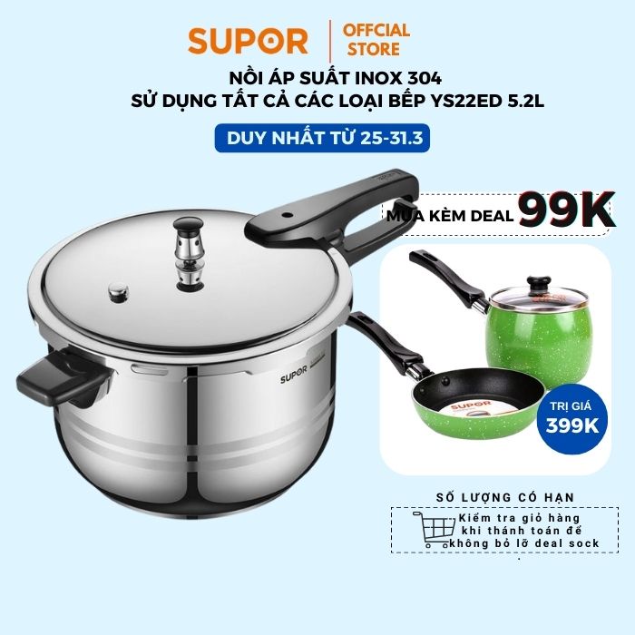 Nhà cửa & Đời sống > Dụng cụ nhà bếp > Nồi || Nồi áp suất bếp từ Supor 5.2L inox 304 5 Lớp hạn chế ăn mòn, giữ nhiệt bền lâu, an toàn cao cấp Quick YS22ED (Bạc)Còn hàng