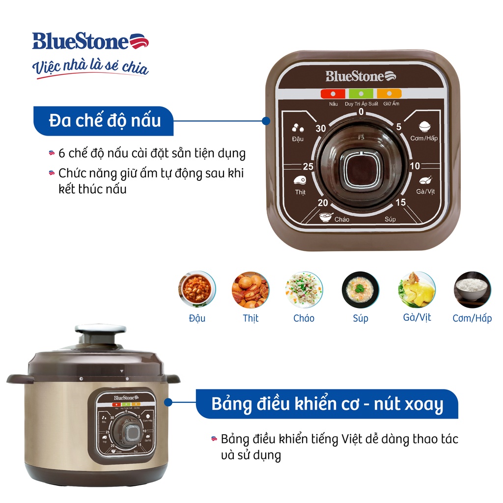 - Nồi áp suất BlueStone có bảng điều khiển cơ núm xoay tiếng Việt dễ dàng thao tác và sử dụng ngay cả với người lần đầu sử dụng. Cùng 5 chế độ nấu cài đặt sẵn tiện dụng: Hấp, nấu cơm, gà/vịt, nấu cháo/thịt, nấu súp, nấu đậu. Và chức năng giữ ấm tự động sau khi kết thúc nấu.