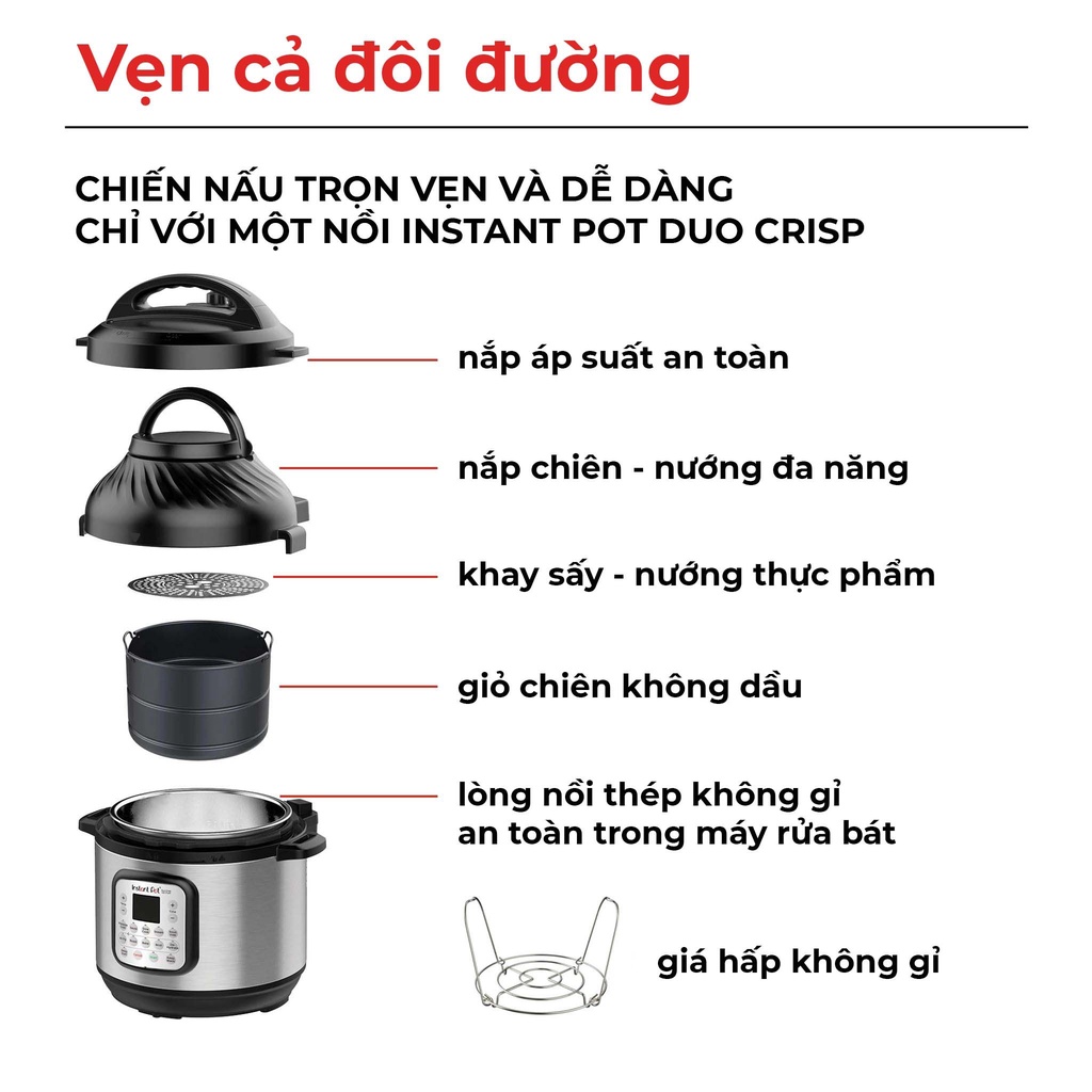 Từ nhà sản xuất của dòng Instant Pot Duo ™, nồi áp suất kiêm nồi chiên không dầu Duo Crisp ra đời, tích hợp lên đến 2 chức năng lớn chỉ trong 1 chiếc nồi. Chức năng nấu áp suất giúp phục vụ các bữa ăn ngon nhanh hơn đến 70% so với các phương pháp nấu ăn truyền thống, nấu chín thức ăn từ từ đến độ chín mềm vừa có thể làm các món giòn rụm như chiên ngập dầu nhưng với ít dầu hơn 95%. Dễ dàng chuyển từ nấu áp suất sang chiên không dầu với nắp nồi chiên không dầu có thể tháo rời đi kèm. Với rất nhiều chương trình nấu ăn thông minh được tích hợp sẵn, bạn có thể chế biến nhiều món ăn yêu thích hơn chỉ bằng một nút bấm. Instant Pot Duo Crisp mang đến sự chất lượng, sự tiện lợi và tính linh hoạt mà bạn mong đợi từ như chính cái tên Instant - hãy tự mình khám phá chiếc nồi này nhé!
