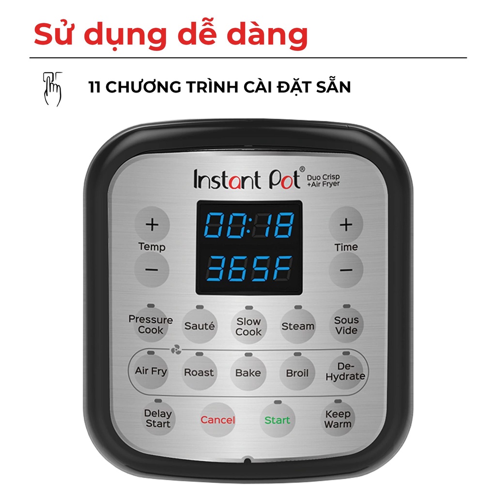 11 chức năng trong chiếc nồi: Chiên không dầu, nướng, nướng bánh, nướng bề mặt, sấy khô, nấu áp suất, nấu chậm, hấp, chảo xào, giữ ấm, sous vide.