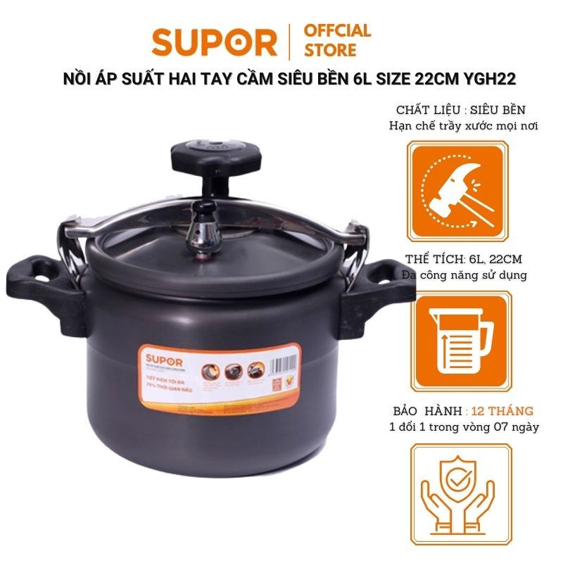 Nồi áp suất cơ Supor YGH22 có dung tích 6 lít cho phép bạn chế biến một lượng lớn thức ăn chỉ trong một lần nấu với tốc độ nhanh, tiết kiệm gas.