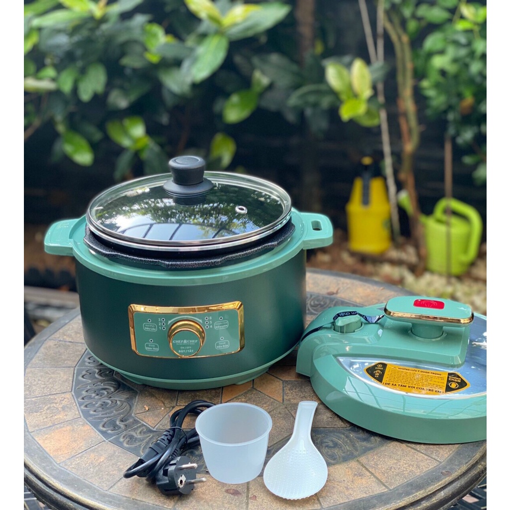 - Nồi áp suất đa năng CHEF&CHEF 4 Lít có nắp áp suất và nắp vung kính Có thể làm nồi lẩu, nấu cơm, chiên, xào, rán đều được. Lõi nồi dày 5 lớp, dùng nấu gà thuốc bắc, hầm xương, nấu cháo rất mềm và nhanh chín ạ!
