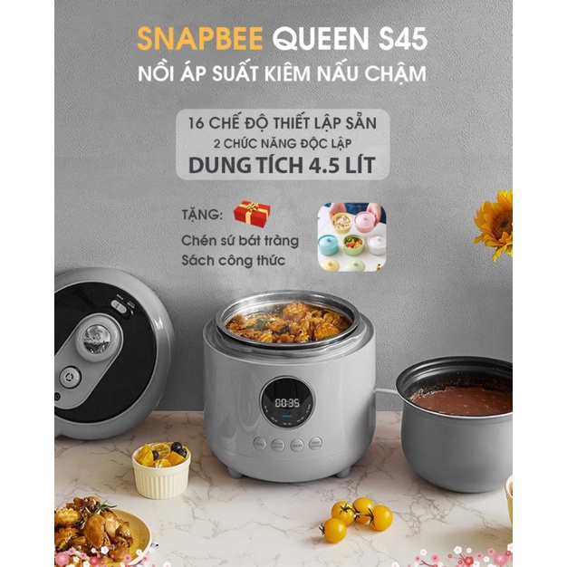Thiết Bị Điện Gia Dụng > Đồ gia dụng nhà bếp > Nồi áp suất || Nồi áp suất đa năng SnapBee Queen S45 hầm hấp chiên xào lẩu nấu cháo 4.5LCòn hàng