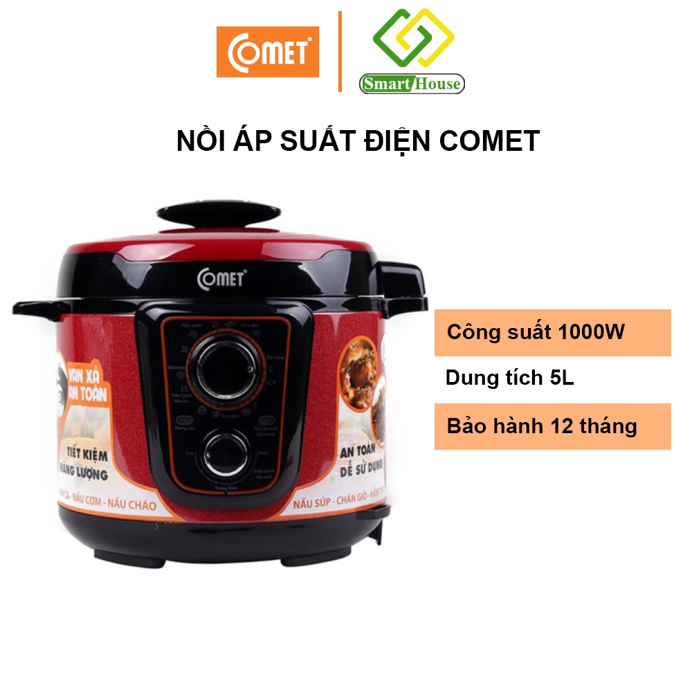 - Nồi áp suất Comet dung tích 5L hỗ trợ bạn nấu và hầm các món ăn trong thời gian ngắn, giúp tiết kiệm thời gian và công sức khi nấu nướng. Nồi với 8 chức năng như hầm đậu, thịt bò, gân, xương và nấu các món cơm, canh, súp, cháo…, thức ăn được nấu bằng nồi áp suất sẽ có vị thơm ngon mà không bị mất chất dinh dưỡng. Nồi áp suất Comet còn có thiết bị điều chỉnh nhiệt và nắp khóa an toàn, đảm bảo an toàn tuyệt đối cho người sử dụng.