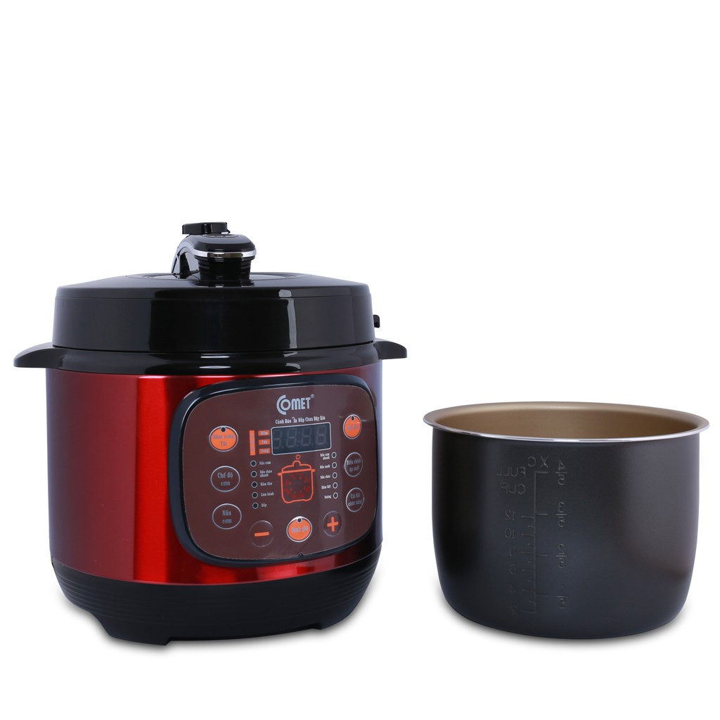 - Nồi áp suất Comet dung tích 6L hỗ trợ bạn nấu và hầm các món ăn trong thời gian ngắn, giúp tiết kiệm thời gian và công sức khi nấu nướng. Nồi với 10 chức năng như hầm đậu, thịt bò, gân, xương và nấu các món cơm, canh, súp, cháo…, thức ăn được nấu bằng nồi áp suất sẽ có vị thơm ngon mà không bị mất chất dinh dưỡng. Nồi áp suất Comet còn có thiết bị điều chỉnh nhiệt và nắp khóa an toàn, đảm bảo an toàn tuyệt đối cho người sử dụng.