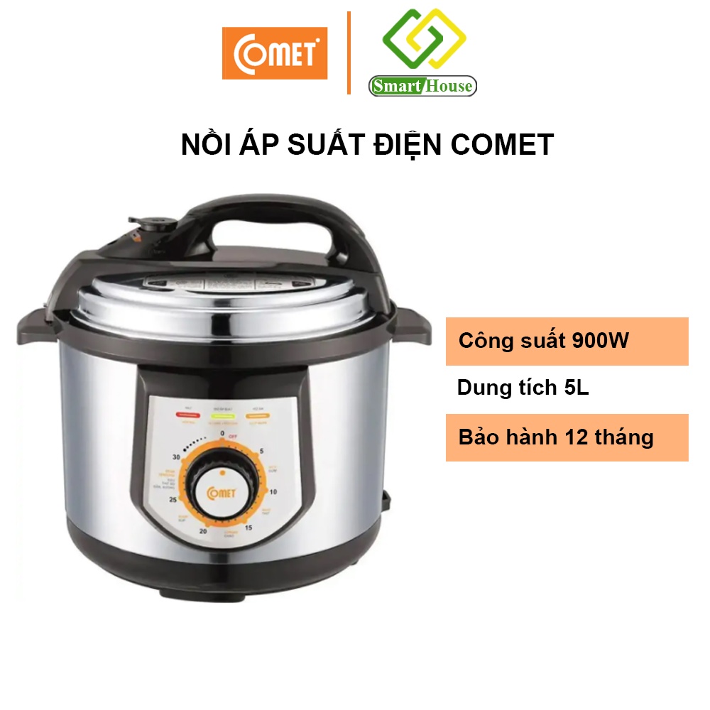 - Nồi áp suất Comet dung tích 5L hỗ trợ bạn nấu và hầm các món ăn trong thời gian ngắn, giúp tiết kiệm thời gian và công sức khi nấu nướng. Nồi với 10 chức năng như hầm đậu, thịt bò, gân, xương và nấu các món cơm, canh, súp, cháo…, thức ăn được nấu bằng nồi áp suất sẽ có vị thơm ngon mà không bị mất chất dinh dưỡng. Nồi áp suất Comet còn có thiết bị điều chỉnh nhiệt và nắp khóa an toàn, đảm bảo an toàn tuyệt đối cho người sử dụng.