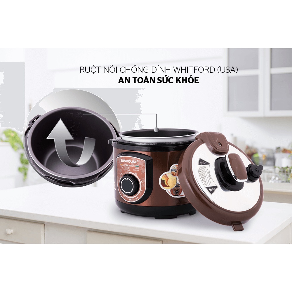 Nồi áp suất điện đa năng SUNHOUSE SHD1550 cà phê, Lòng nồi phủ 3 lớp chống dính Whitford, Hệ thống van xả áp tự động