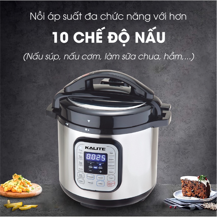 Nồi áp suất điện Kalite KL – 636 được thiết kế với bảng điều khiển lập trình sẵn hơn 10 chế độ nấu dành cho các món hàng ngày như: nấu súp, nấu cơm, nấu gạo lứt và ngũ cốc, nấu đậu, nấu yến mạch, nấu thịt gia cầm, làm sữa chua,…