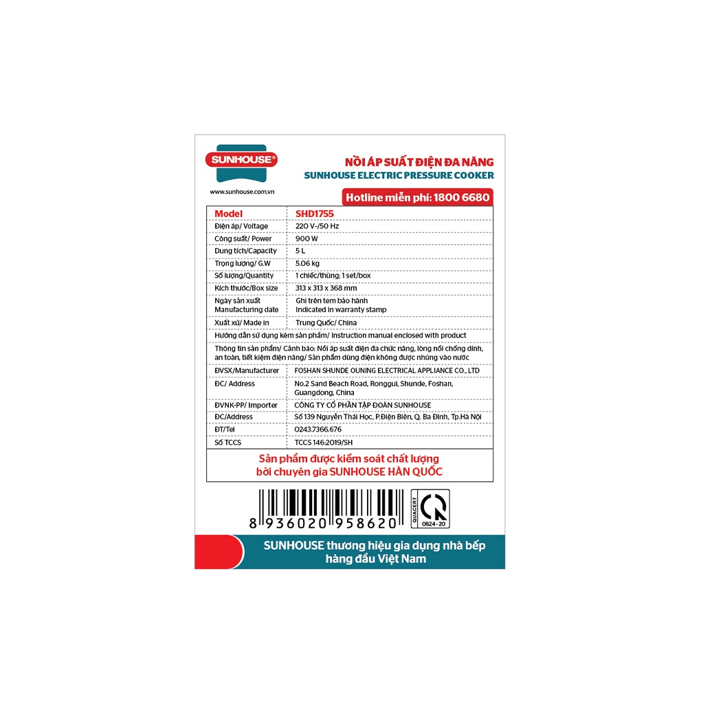 [Mã ELHADEV giảm 4% đơn 300K] Nồi áp suất điện Sunhouse SHD1755 5 lít