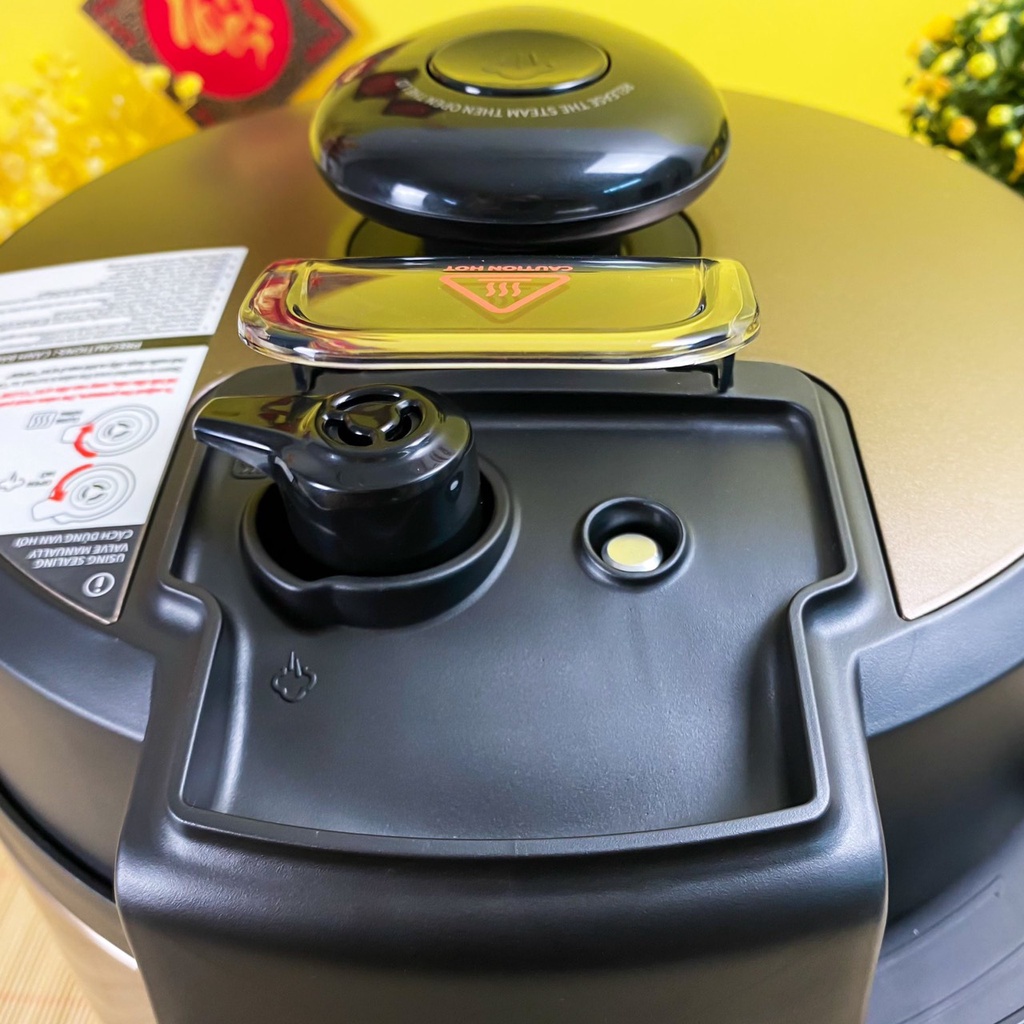 - Lỗ thoát hơi có nắp đậy an toàn. Giảm áp suất bằng nút thả an toàn giúp giữ tay tránh khỏi hơi nước nóng.