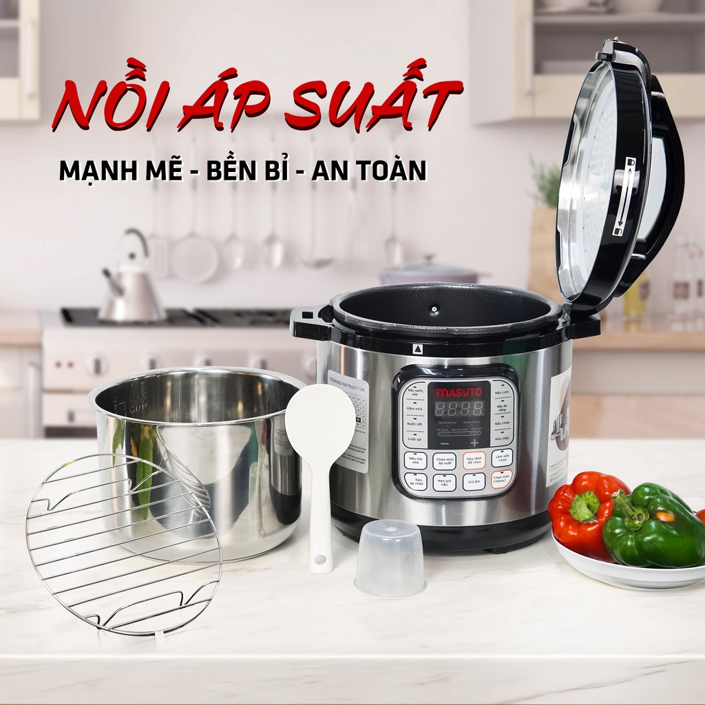 Thiết Bị Điện Gia Dụng > Đồ gia dụng nhà bếp > Nồi áp suất || Nồi áp suất điện tử đa năng Masuto 6 lít CN Nhật nấu cơm cháo hầm siêu nhừ ruột Inox 304 siêu bền MUA 1 TĂNG 1Còn hàng