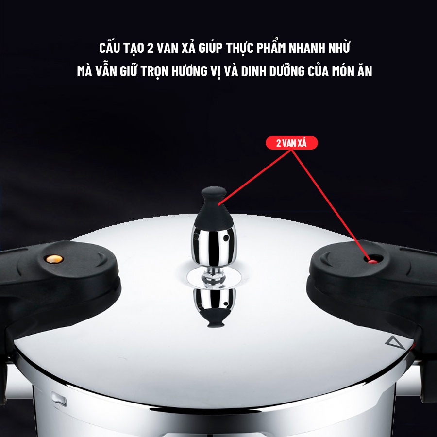 Nắp đậy được trang bị gioăng cao su kín khít kết hợp với Cấu tạo 2 van xả giúp nấu chín thực phẩm nhanh nhừ mà vẫn giữ trọn hương vị và dinh dưỡng của thực phẩm, bồi bổ tốt cho sức khỏe.
