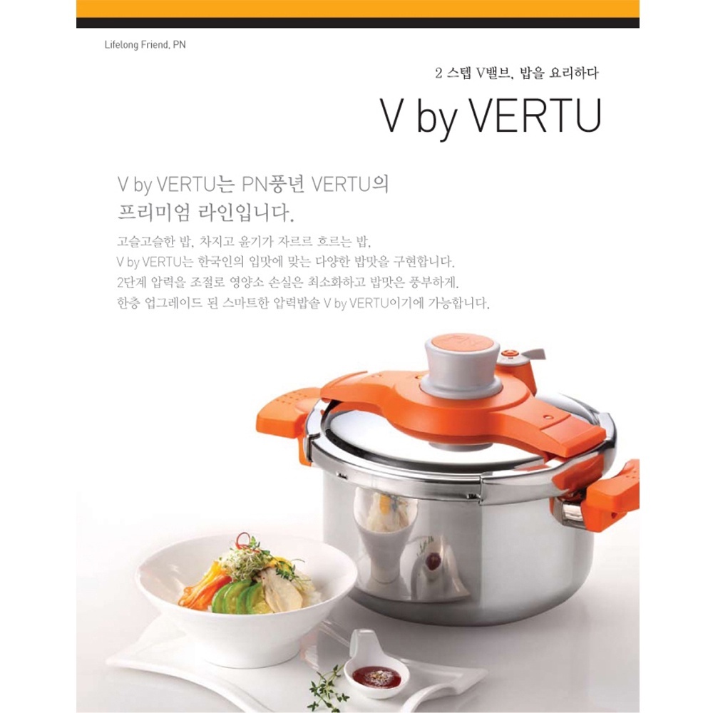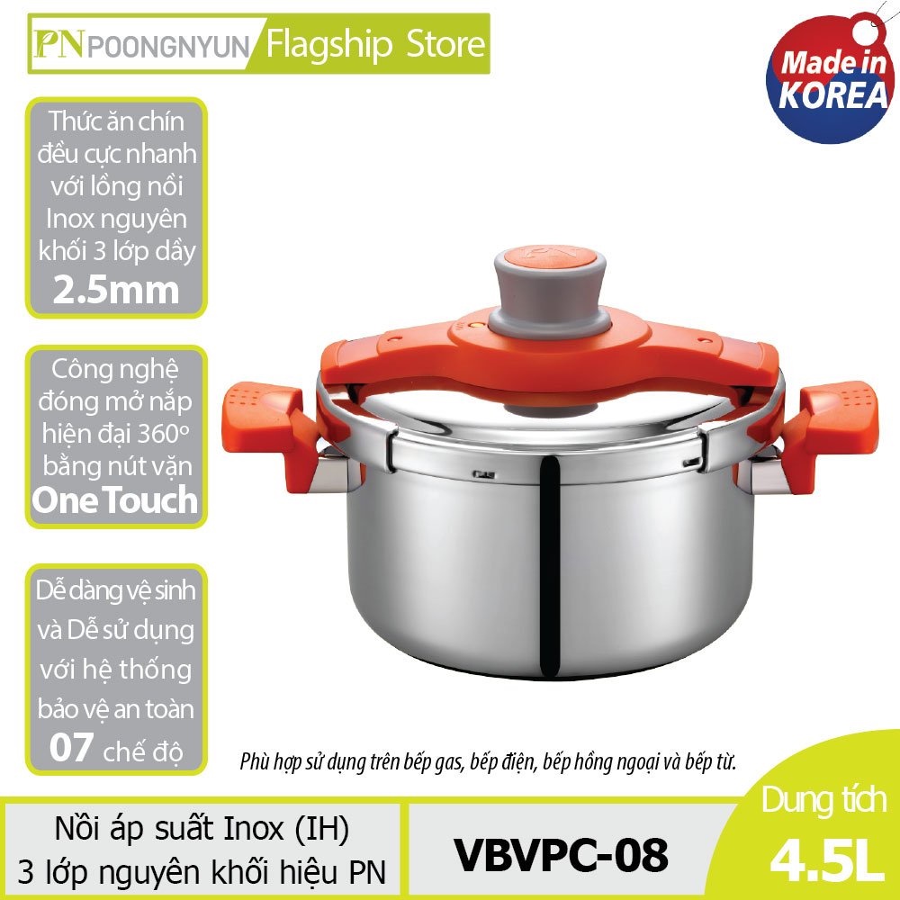 Nồi áp suất cao cấp Inox từ tính hiệu PoongNyun Series Vertu V 3 lớp nguyên khối thân & đáy dầy 2.5mm giữ và gia nhiệt lâu hơn giúp thức ăn mau chín tiết kiệm thời gian và nhiên liệu, sử dụng trên bếp gas, bếp hồng ngoại và bếp từ, tay cầm ngắn và chống nóng, áp dụng công nghệ đóng mở nắp hiện đại (One Touch) bằng nút vặn, chức năng khóa an toàn và khóa nắp tự động thông minh 7 chế độ, 2 mức điều chỉnh lượng hơi thoát ra ngoài, có ghim Inox thông van xả kèm theo sản phẩm thuận tiện sử dụng cho gia đình, màu Inox viền cam.- Xuất xứ : Made In Korea
