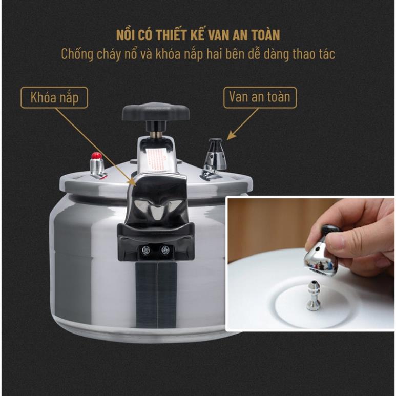 Thiết kế gọn gàng thuận tiện cho việc cất giữ, tiết kiệm không gian. Đặc biệt, sản phẩm không hoen gỉ, an toàn cho người dùng. Nồi có thiết kế van an toàn chống cháy nổ và khóa nắp hai bên dễ dàng thao tác, chỉ cần kéo nhẹ 2 bên là có thể mở nắp. Khóa an toàn giúp nồi giữ được áp suất, hơi nước để có thể làm thực phẩm nhanh chín và tránh gây bỏng cho người sử dụng. Phần quai nồi là nhựa cao cấp có khả năng chịu nhiệt cao, không nóng chảy khi thường xuyên chịu nhiệt độ cao, an toàn khi chạm vào.