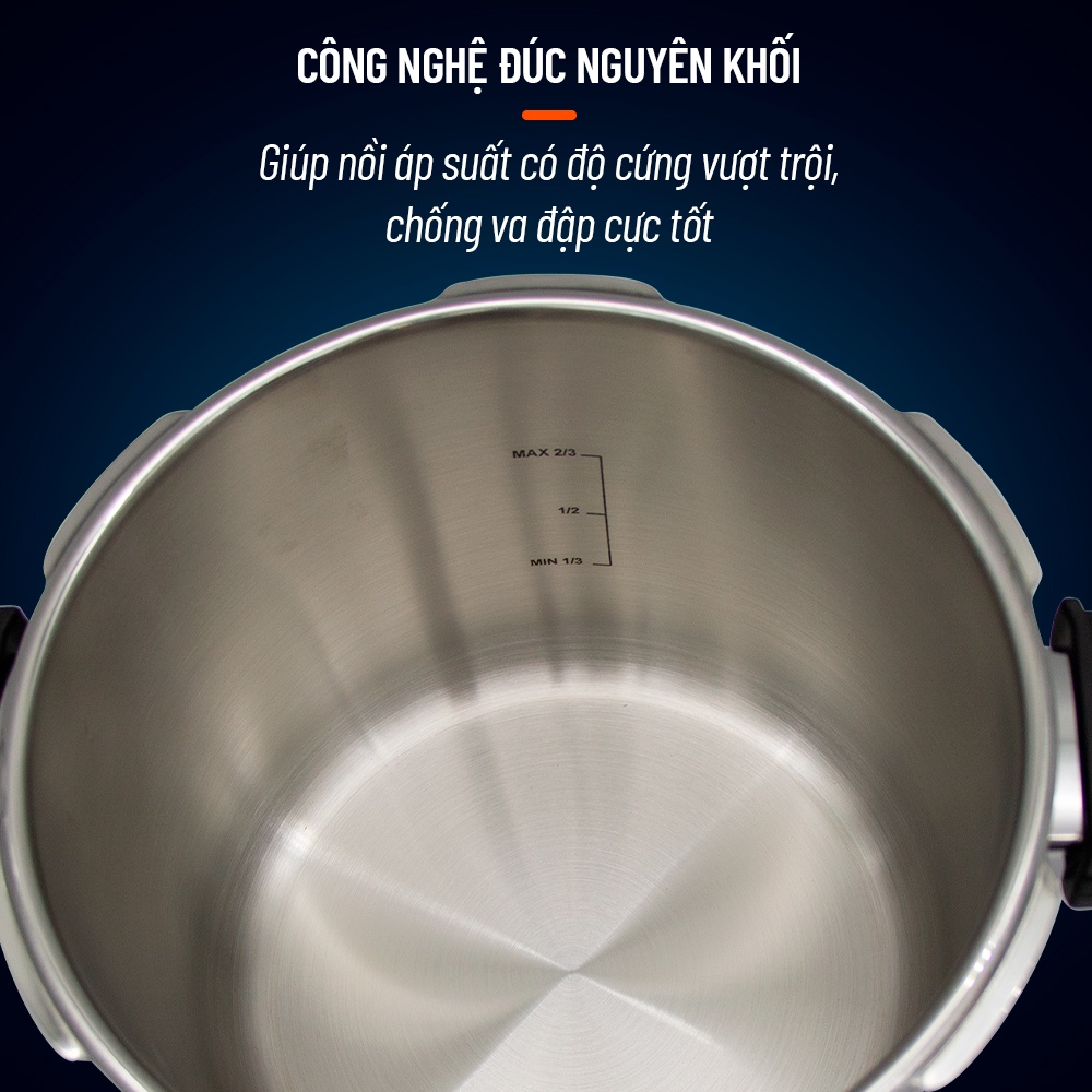 - Hệ thống khóa kép an toàn, chỉ mở nắp khi áp suất giảm về ngưỡng cho phép