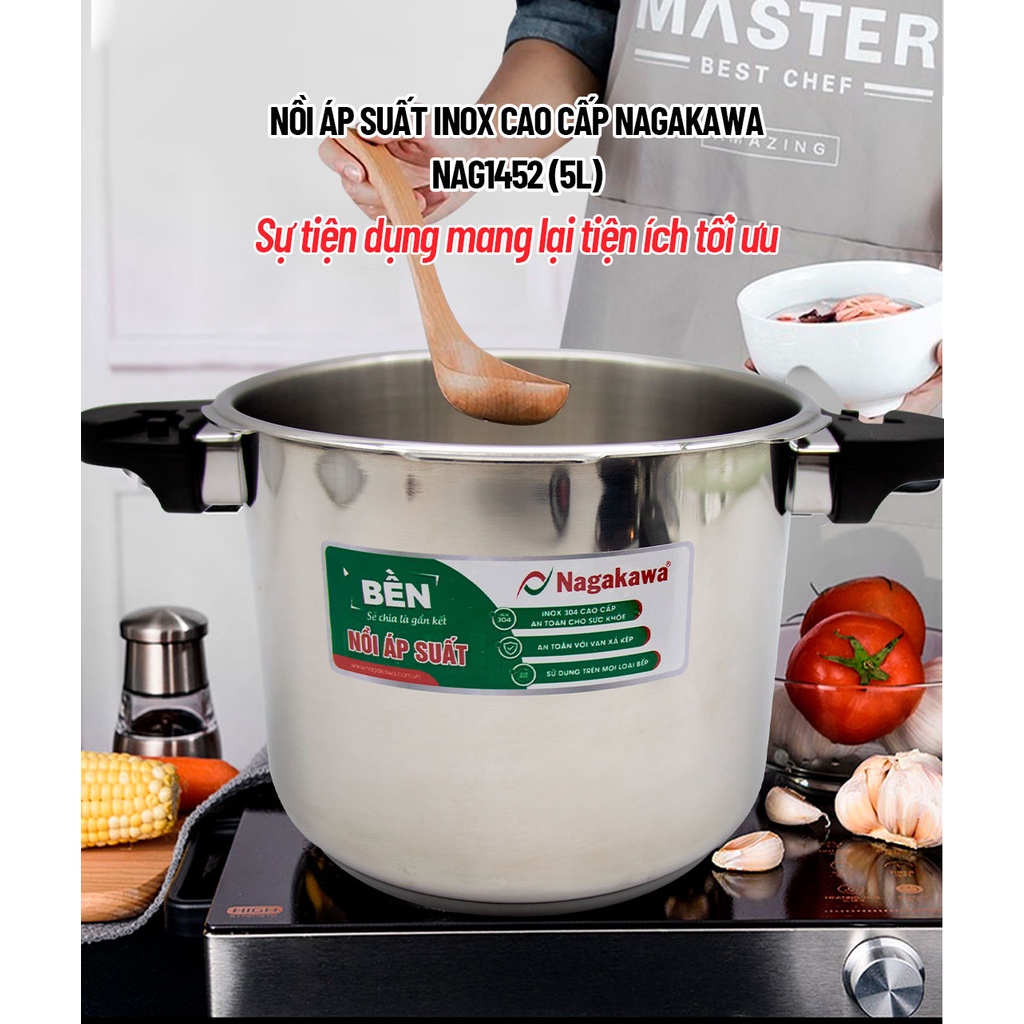 Nồi áp suất inox 304 cao cấp Nagakawa NAG1452 (5L) - Van xả kép - Dùng trên mọi loại bếp - Hàng chính hãngZoomRê chuột lên hình để phóng to