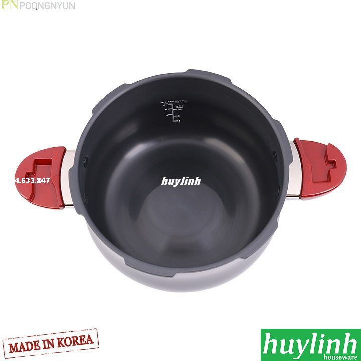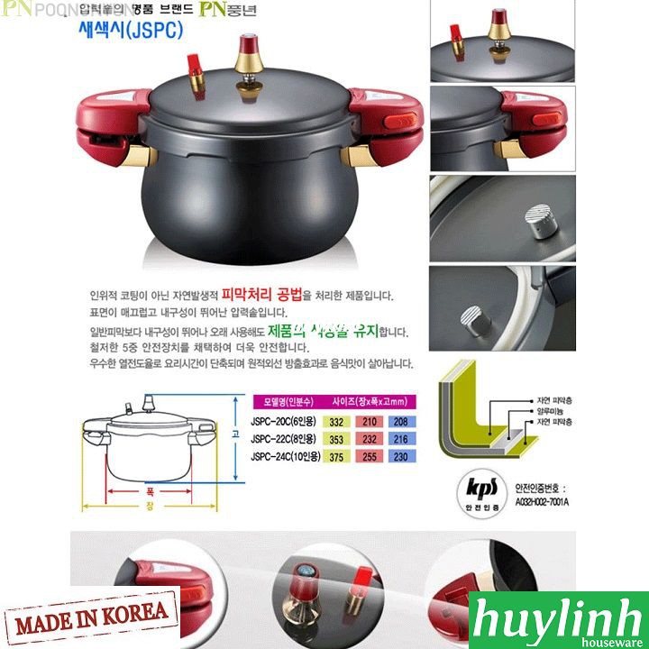 Nồi áp suất PoongNyun JSPC-20CV có dung tích 3.4 lít, được làm từ nhôm chống dính cao cấp dày 4.0mm với công nghệ tráng men hiện đại nhất.Sản phẩm được sản xuất và nhập khẩu từ Hàn Quốc, Huy Linh phân phối Chính Hãng