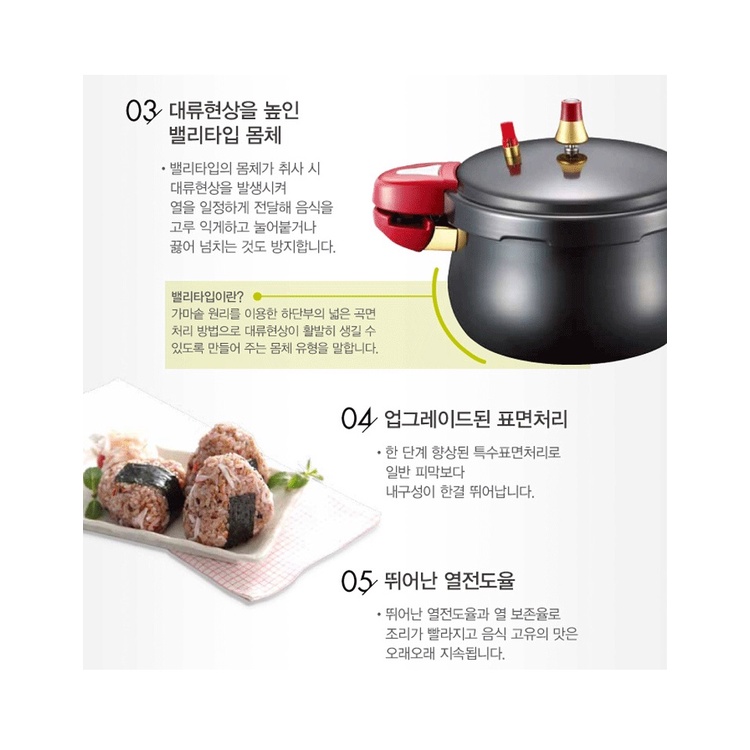 Toàn bộ cấu trúc nhôm tinh khiết nguyên khối cao cấp dầy 4mm cực kỳ bền và không bong tróc, nồi áp suất nhôm chống dính POONGNYUN (PN) JSPC-20CV tối đa hóa hiệu suất dẫn và giữ nhiệt làm thức ăn chín đều cực nhanh mà thức ăn không bị cháy khét, tiết kiệm thời gian cũng như chi phí nhiên liệu nấu và giảm sự phá hủy chất dinh dưỡng trong quá trình nấu ăn một cách hiệu quả. Hơn thế nữa, với công nghệ nấu áp suất khoa học để tăng điểm sôi của nước lên 120ºC và chịu được sự gia nhiệt lên đến 400ºC làm thức ăn chín mềm nhanh hơn so với khi nấu bằng áp suất điện.