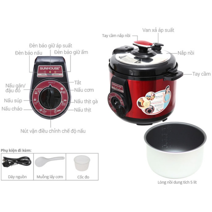 Nồi áp suất - Nồi áp suất điện đa năng sunhouse công suất 900W, nấu nhanh, chống dính, dung tích 5L - Bảo hành 12 tháng✅✅✅ĐẶC ĐIỂM NỔI BẬT: