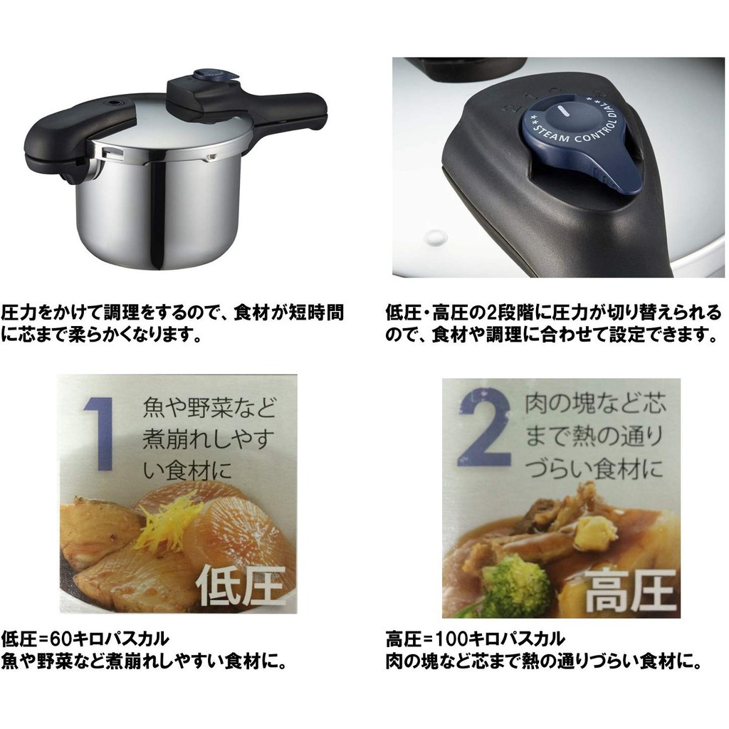 - Có thể điều chỉnh áp suất theo 2 mức:+ Mức 1 - 60kPA (áp suất thấp) nấu cá, rau củ quả.+ Mức 2 - 100kPA (áp suất cao) nấu thịt, hầm xương…