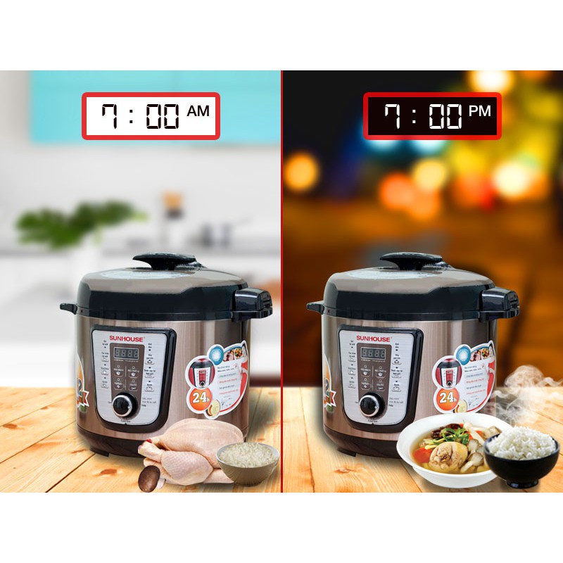 Nồi áp suất Sunhouse có chức năng hẹn giờ lên đến 24 tiếng thật tiện lợi, nồi tự động hoạt động khi hết giờ đếm ngược, có chuông báo hiệu khi kết thúc quá trình nấu, nhờ đó người dùng không cần nấu đúng bữa mà vẫn đảm bảo bữa cơm gia đình luôn nóng sốt.