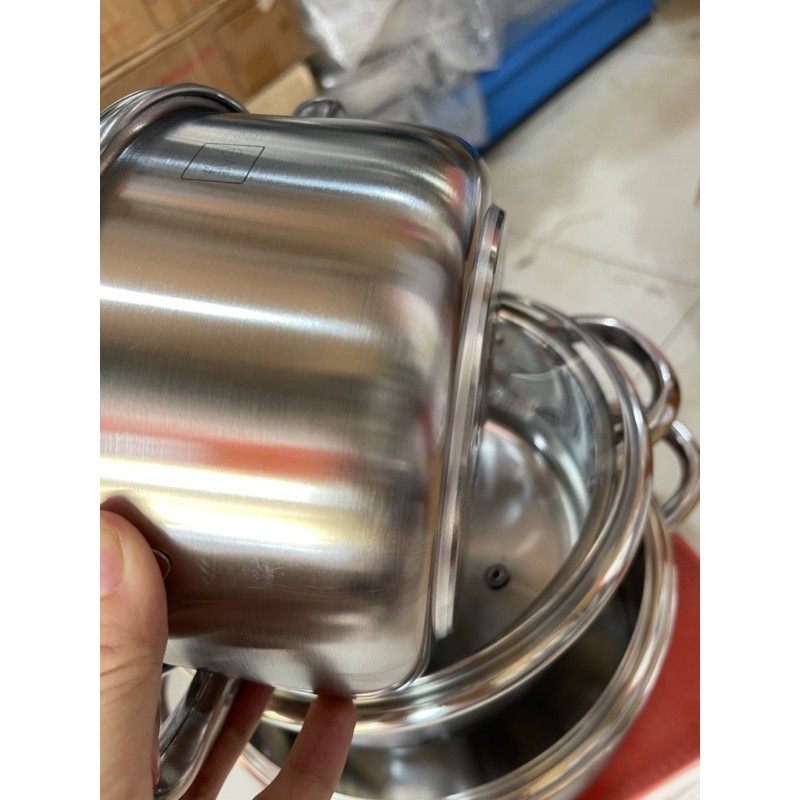 - Bộ nồi bếp từ inox 3 đáy chất liệu inox 430 bền tốt, sáng bóng, an toàn sức khỏe người dùng.