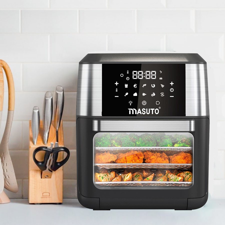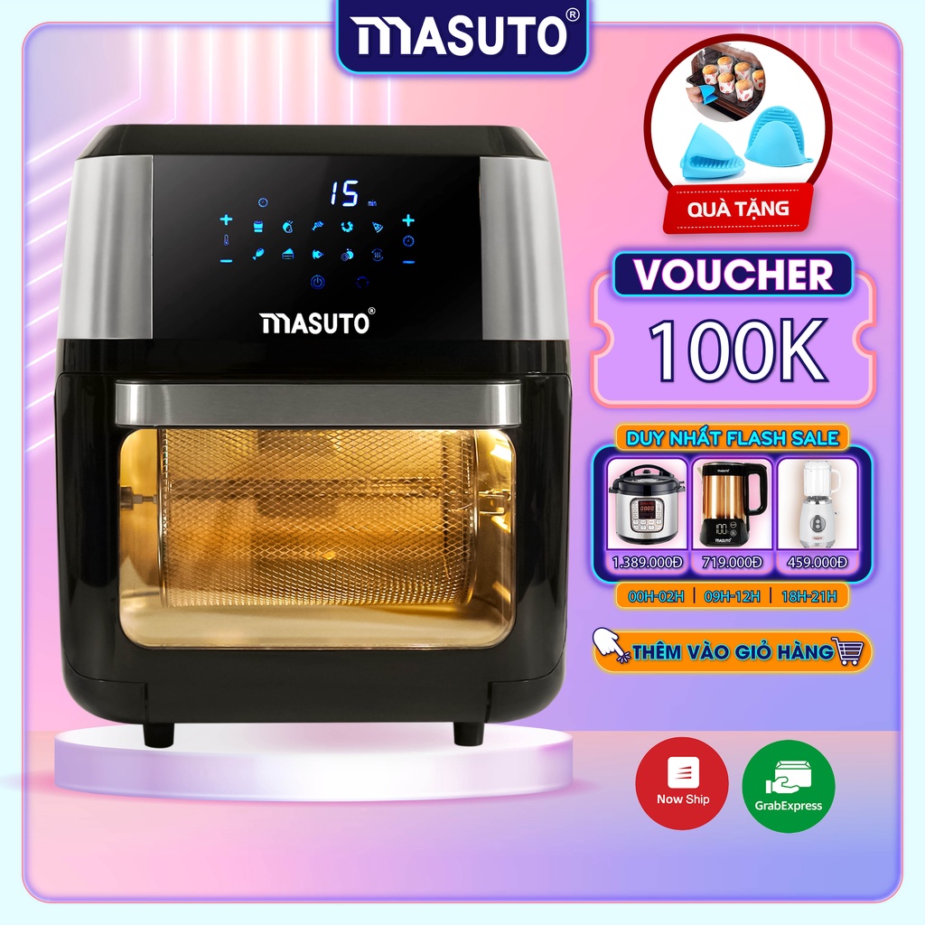 Nồi bếp chiên không dầu kiêm lò nướng chính hãng Masuto 12L quay gà nguyên con chiên khoai siêu giòn
