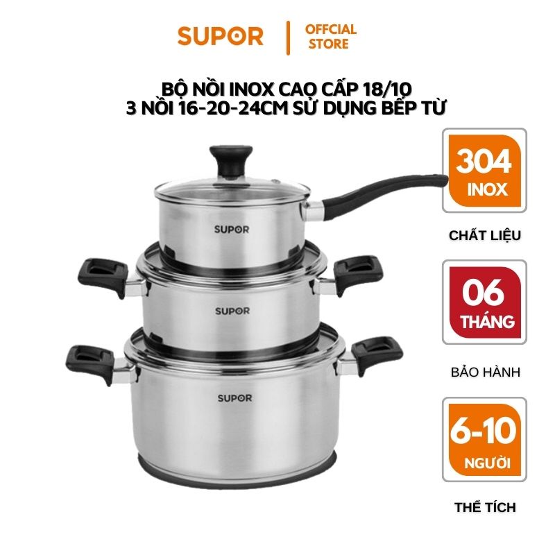 Nhà cửa & Đời sống > Dụng cụ nhà bếp > Nồi || Bộ nồi bếp từ inox cao cấp 100% chất liệu 18/10 Supor 16-20-24cm hàng chính hãng H20211-T1Còn hàng