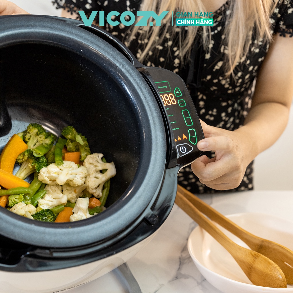 - Robot nấu ăn VICOZY là một thiết bị nhà bếp thông minh có thể thay thế chảo rán, chảo xào, nồi hầm, nồi cơm, nồi gang..... mà lại không gây khói, không bám mùi. Đặc biệt chị em phụ nữ sẽ không cần phải đứng bếp để đảo, canh khi nấu