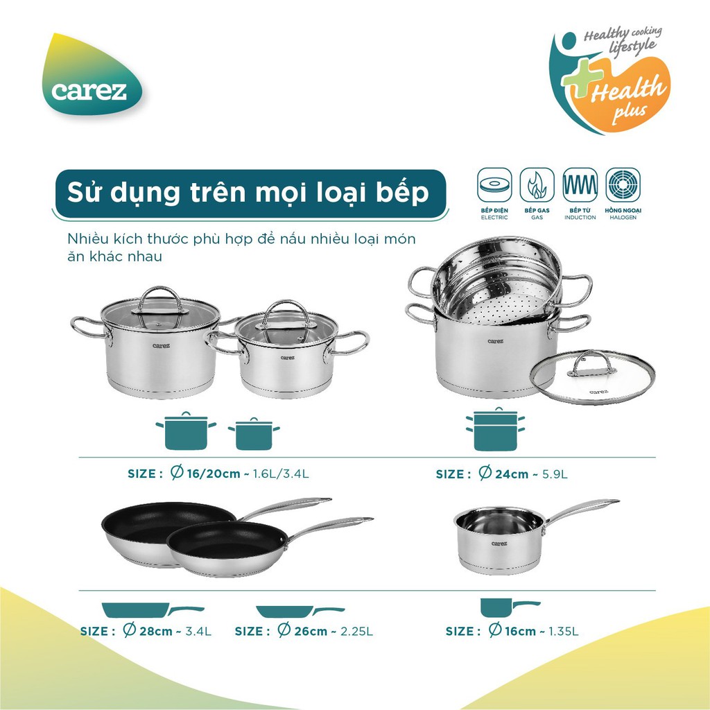 - Bộ nồi 7 món cao cấp Carez CPC755SI-07 gồm 3 nồi (+nắp), 1 quánh, 1 xửng, 2 chảo chiên đáp ứng đầy đủ nhu cầu nấu ăn của gia đình một cách thuận tiện nhất- Đặc biệt, toàn bộ 7 món trong bộ nồi đều được làm từ 304 có thể sử dụng được trên nhiều loại bếp, kể cả bếp từ, an toàn khi tiếp xúc với thực phẩm, đảm bảo sức khỏe người sử dụng.