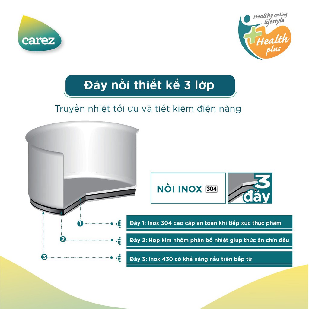 - Đáy nồi được thiết kế 3 lớp giúp truyền nhiết tối ưu, giữ nóng lâu hơn và tiết kiệm điện năng.