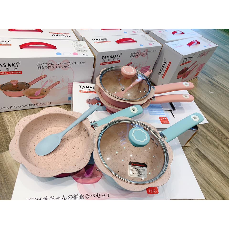 Bộ nồi chảo chống dính Baby Tamasaki Nhật Bản đường kính miệng 16cm tặng kèm thìa dùng bếp từ - Hàng chính hãng
