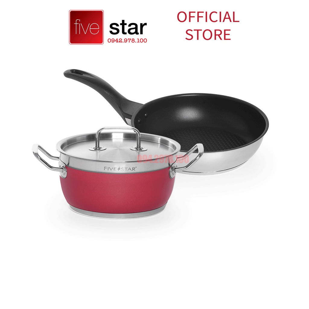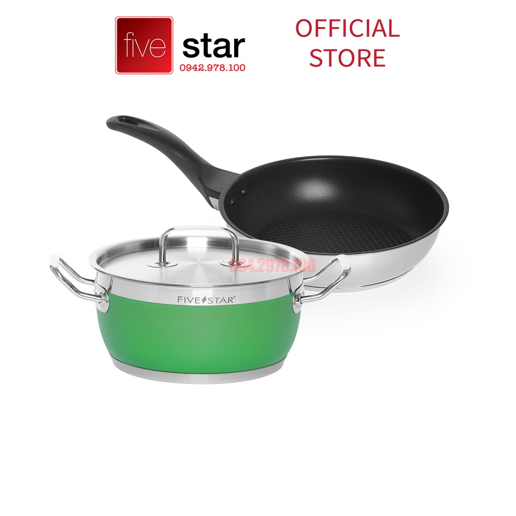 Bộ nồi chảo chống dính cao cấp Fivestar 2 món nắp inox , 3 đáy từ , inox 430 , tặng 5 muỗng ăn