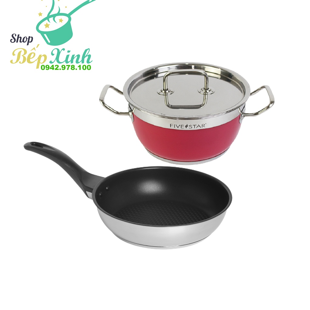 Bộ nồi chảo chống dính cao cấp Fivestar 2 món nắp inox , 3 đáy từ , inox 430 , tặng 5 muỗng ăn