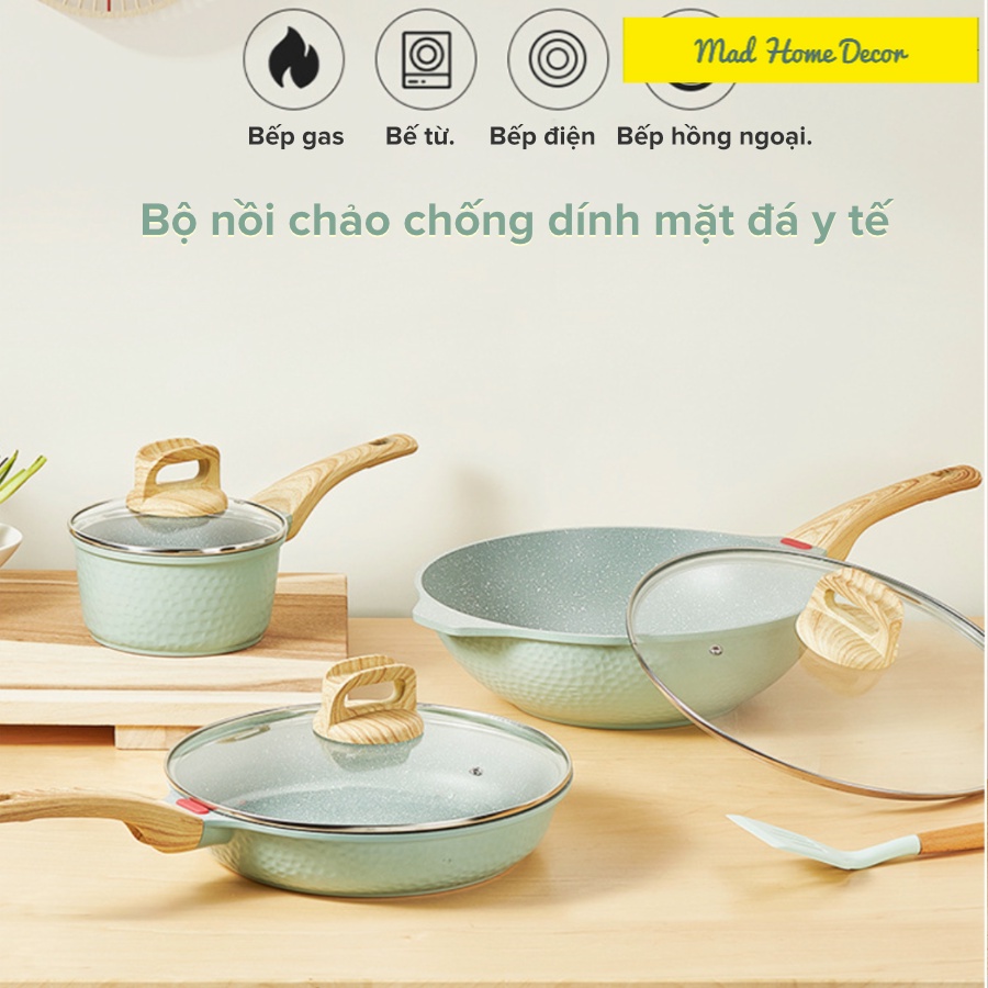 Bộ nồi chảo chống dính mặt đá y tế tay cầm gỗ nắp kính cực xịn xò đã có thêm màu mint hot trend