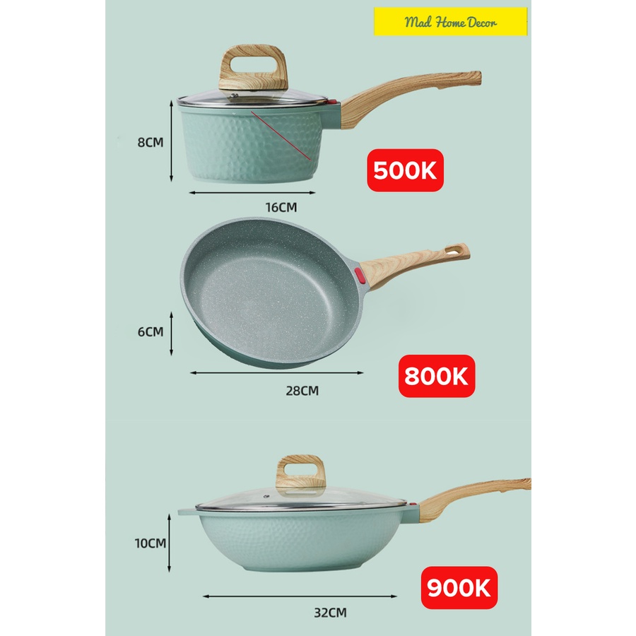 Bộ nồi chảo chống dính mặt đá y tế tay cầm gỗ nắp kính cực xịn xò đã có thêm màu mint hot trend nhé các nàng.Bộ nồi chảo gồm 3 món: nồi nhỏ nấu soup, nấu cháo, sữa nóng cho em bé + 1 chảo dán đk 28cm + 1 chảo xào lòng sâu đk 32cm.