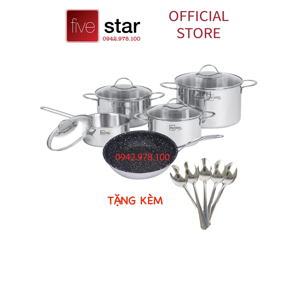 Bộ nồi chảo chống dính vân đá 3 lớp đáy liền inox 304 Fivestar Plus 5 món quai oval nắp kính , tặng 10 muỗng ăn- Thương hiệu: Fivestar