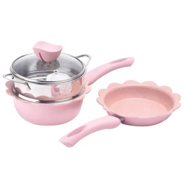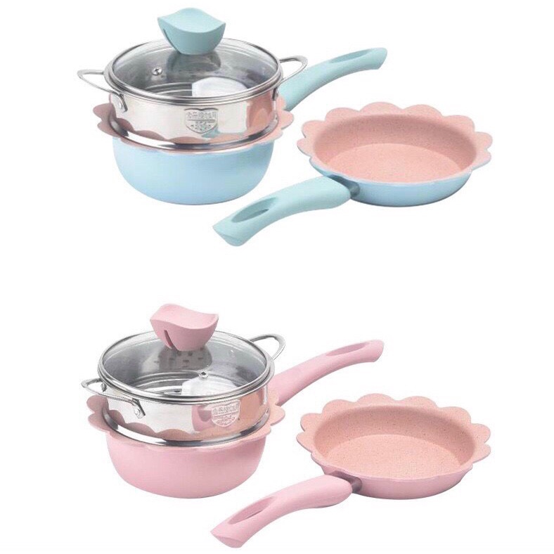 Nồi Chảo Đá Hóa Nấu Đồ Ăn Dặm Cho Bé, Set Chảo Đá Hoa Chống Dính Dùng Được Cả Bếp Từ Nấu Đồ Ăn Dặm Cho Bé Và Gia Đình🌈 Bộ nồi cháo đá hình hoa dễ thương cho bé tặng kèm xửng hấp