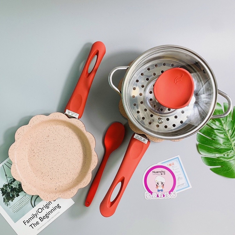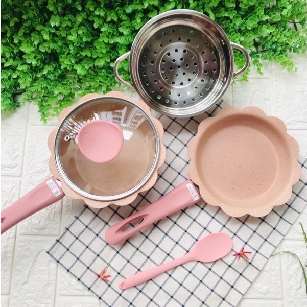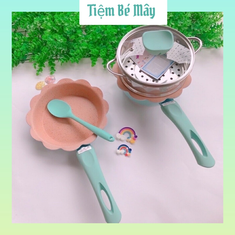Nồi chảo đá chống dính hình hoa kèm xửng hấp nấu đồ ăn dặm, bộ nồi chảo đa năng nấu đồ ăn dặm cho bé