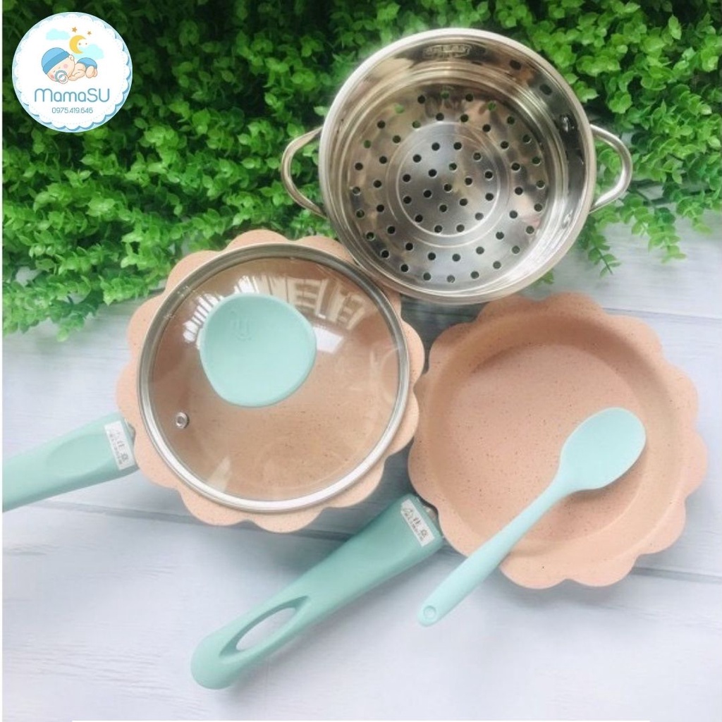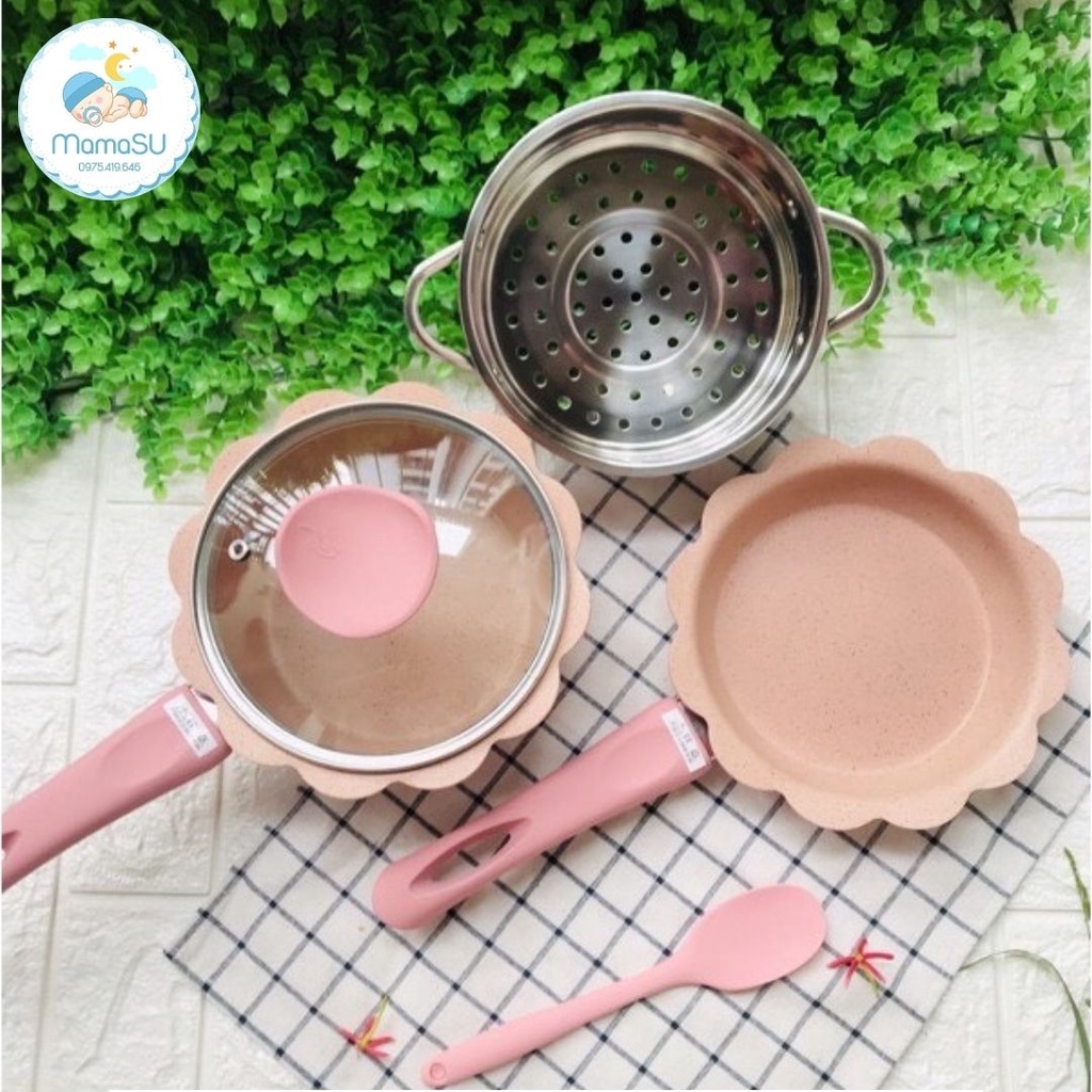 (CÓ SẴN) Bộ nồi chảo đá hình hoa cho bé ăn dặm cao cấp chống dính kèm lồng hấp nấu chế biến đồ gia đình dùng được bếp từ