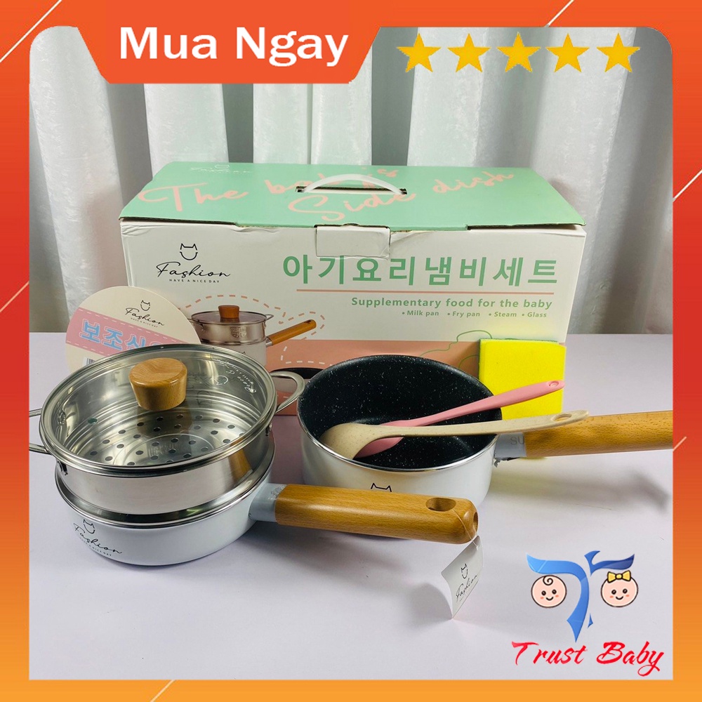 Bộ nồi ăn dặm nấu cháo bột + chảo kèm xửng hấp cho bé FASHION cao cấp