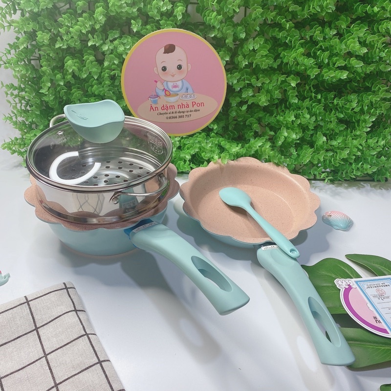 Nồi chảo đá nấu ăn dặm cho bé có hấp 16cm (BỘ GỒM NỒI, CHẢO,HẤP VÀ VÁ)