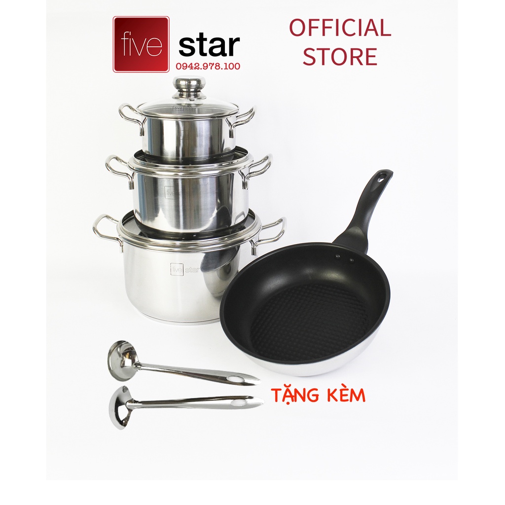 #bộnồiinoxBộ nồi inox Fivestar nắp kính và chảo chống dính , tặng 2 vá canh, inox 430, bếp từ , gas, hồng ngoại