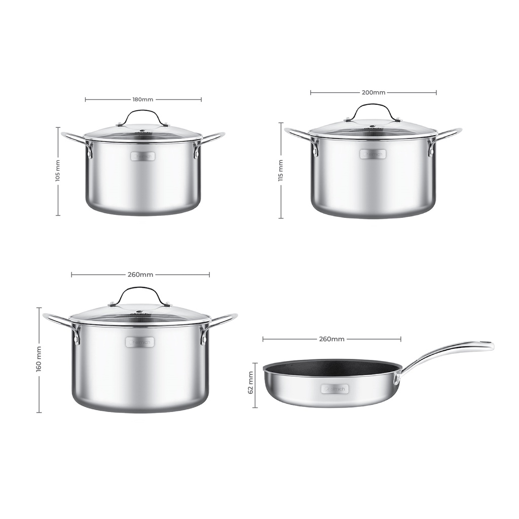 Đa dạng kích cỡ, đáp ứng mọi nhu cầu đun nấu: Bộ sản phẩm gồm 3 nồi các kích cỡ 16 – 20 - 24cm và 1 chảo 26cm, phù hợp với nhiều nhu cầu nấu nướng cùng lúc trong bữa ăn nhờ đó tiết kiệm thời gian và nhiên liệu tối đa. Ngoài ra, một bộ nồi inox cao cấp còn mang tới vẻ đẹp đồng bộ cho căn bếp và tạo cảm hứng nấu ăn cho các bà nôi trợ.