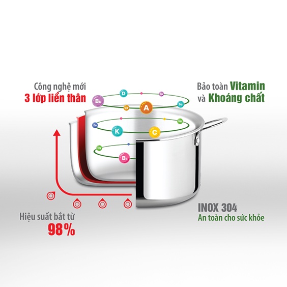 Nồi Trimax sử dụng chất liệu lớp trong cùng là inox 304 cao cấp an toàn cho thực phẩm. Inox 304 được khẳng định là hợp kim inox tuyệt vời, có khả năng chống oxi hóa cao. Hợp kim này hoàn toàn không thôi nhiễm các chất độc hại vào thức ăn, có khả năng chống bám bẩn tối ưu và tuyệt đối an toàn cho sức khỏe.