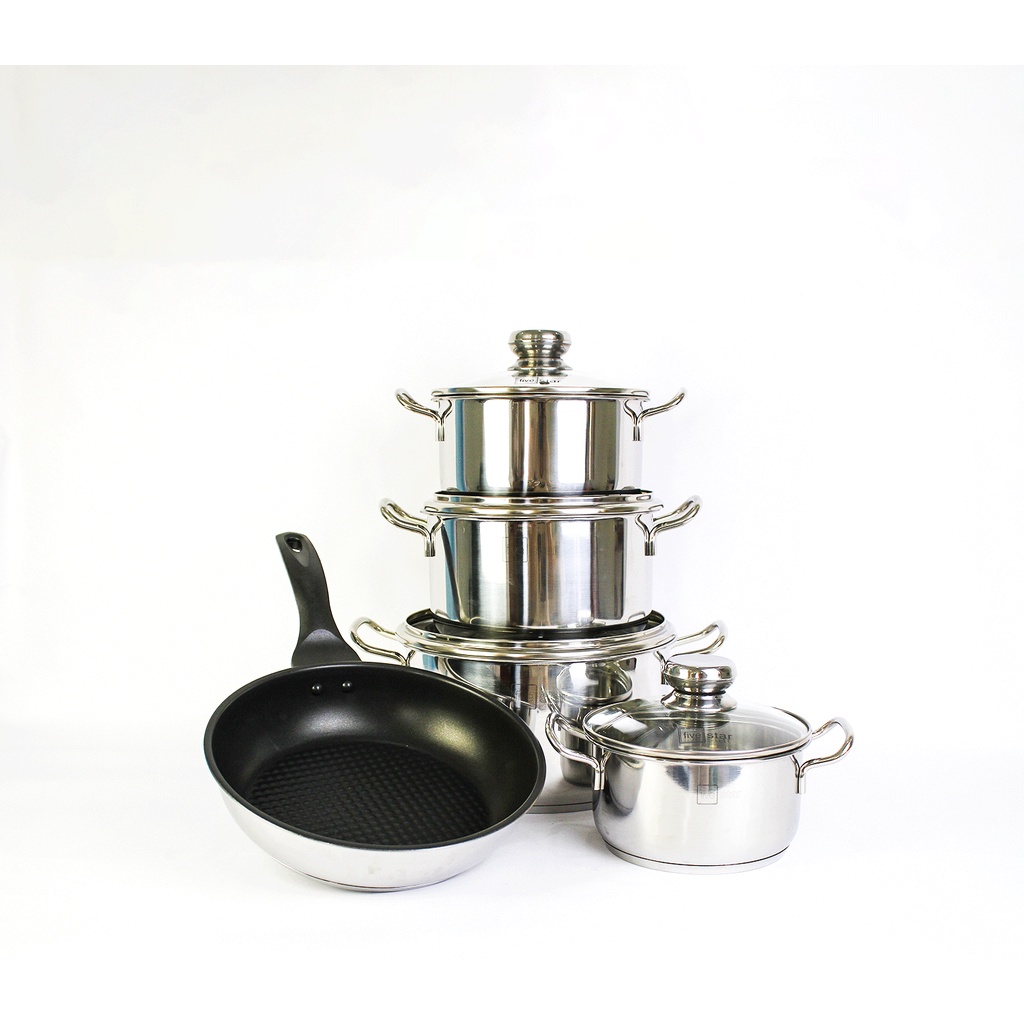 Nhà cửa & Đời sống > Dụng cụ nhà bếp > Nồi || Bộ nồi chảo inox Fivestar 5 chiếc nắp kính 3 đáy, dày 0.8mm ,dùng được bếp từ, hồng ngoại , gas , tặng 5 muỗng ănCòn hàng