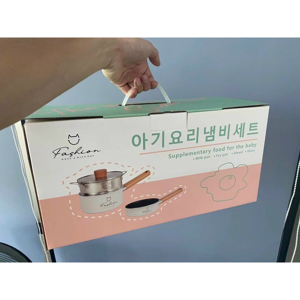 Bộ nồi chảo kèm xửng hấp Fashion Kichen and Love size 16cm bản Hàn chế biến đồ ăn cho bé siêu đẹp