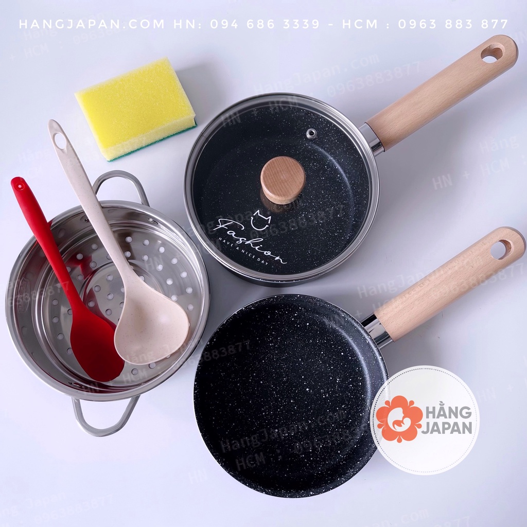 Bộ nồi chảo kèm xửng hấp Fashion cao cấp chống dính, tay cầm gỗ hàng chính hãng