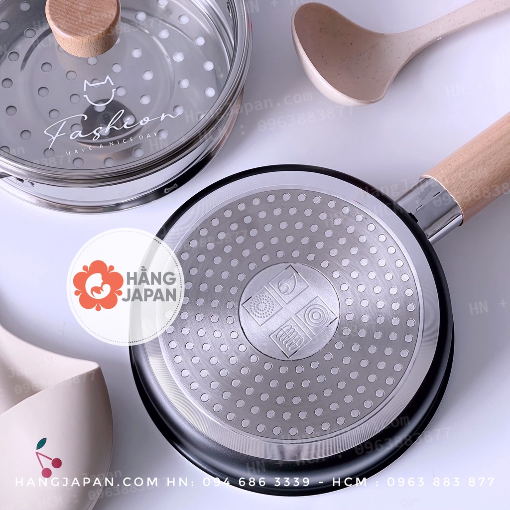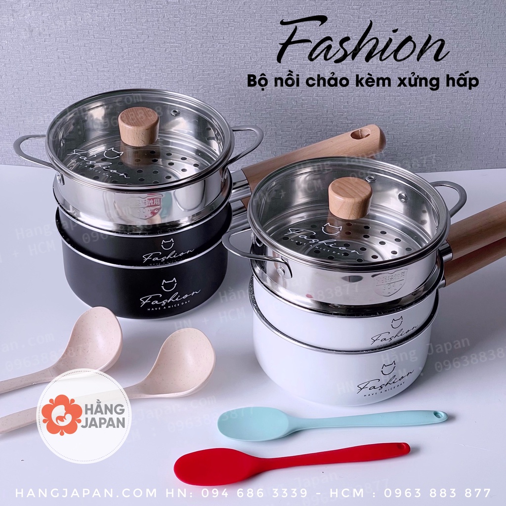 Bộ nồi chảo kèm xửng hấp Fashion cao cấp chống dính, tay cầm gỗ